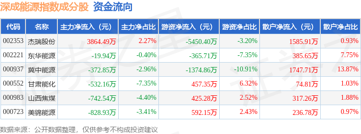 资金流向方面,深成能源(399680)指数成份股当日主力资金净流入合计1368.08万元,游资资金净流出合计5716.19万元,散户资金净流入合计4348.12万元。成份股资金流向详情见下表: