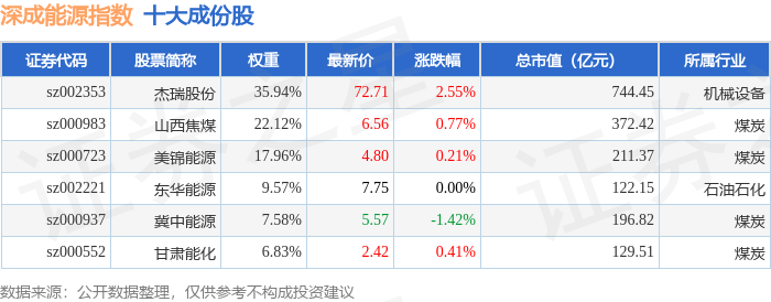 证券之星消息,12月10日,深成能源(399680)指数报收于773.43点,涨1.29%,成交23.63亿元,换手率0.87%。当日该指数成份股中,上涨的有4家,杰瑞股份以2.55%的涨幅领涨,下跌的有1家,冀中能源以1.42%的跌幅领跌。