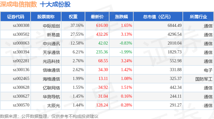 证券之星消息,12月10日,深成电信(399688)指数报收于6784.18点,涨1.51%,成交733.7亿元,换手率4.27%。当日该指数成份股中,上涨的有11家,中瓷电子以10.0%的涨幅领涨,下跌的有4家,天孚通信以1.99%的跌幅领跌。
