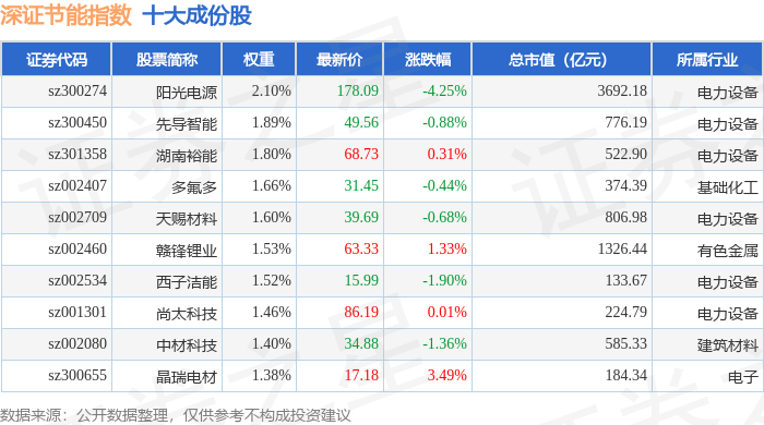 证券之星消息,12月10日,深证节能(399695)指数报收于2864.83点,涨0.02%,成交880.46亿元,换手率1.57%。当日该指数成份股中,上涨的有50家,星源材质以8.13%的涨幅领涨,下跌的有47家,上能电气以4.41%的跌幅领跌。