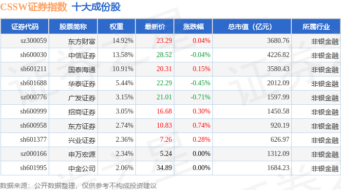 CSSW证券(399707)指数十大成份股详情如下: