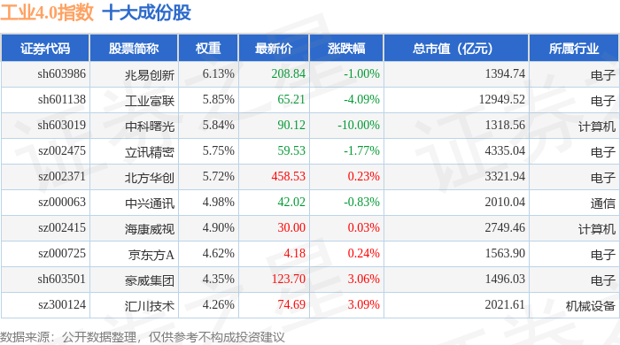 证券之星消息,12月10日,工业4.0(399803)指数报收于5246.52点,跌0.66%,成交712.43亿元,换手率1.62%。当日该指数成份股中,上涨的有33家,伟创电气以3.89%的涨幅领涨,下跌的有47家,中科曙光以10.0%的跌幅领跌。