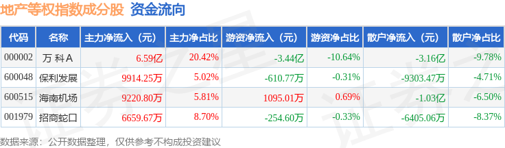 资金流向方面,地产等权(399983)指数成份股当日主力资金净流入合计9.17亿元,游资资金净流出合计3.41亿元,散户资金净流出合计5.76亿元。成份股资金流向详情见下表: