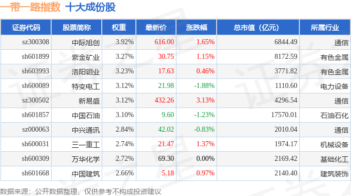 一带一路(399991)指数十大成份股详情如下: