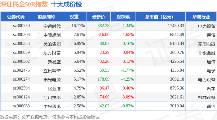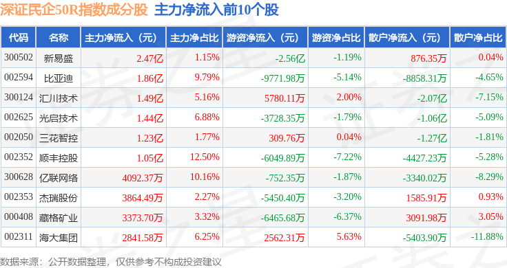 资金流向方面,深证民企50R(470057)指数成份股当日主力资金净流出合计54.18亿元,游资资金净流入合计9.71亿元,散户资金净流入合计44.47亿元。成份股资金流向详情见下表: