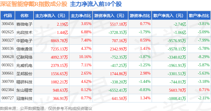 资金流向方面,深证智能穿戴R(470074)指数成份股当日主力资金净流出合计22.85亿元,游资资金净流入合计6.13亿元,散户资金净流入合计16.72亿元。成份股资金流向详情见下表: