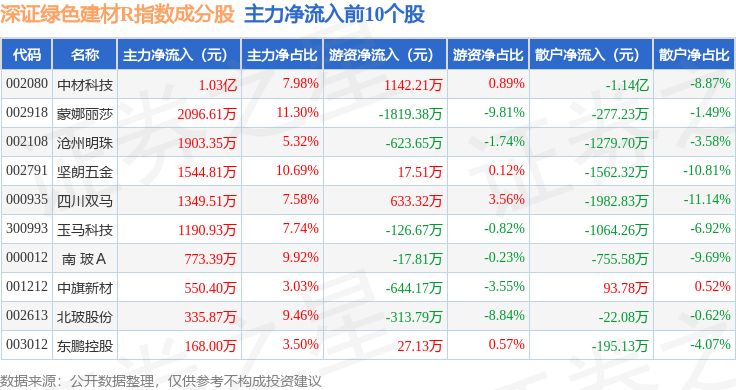 资金流向方面,深证绿色建材R(470077)指数成份股当日主力资金净流入合计706.07万元,游资资金净流入合计4959.4万元,散户资金净流出合计5665.46万元。成份股资金流向详情见下表: