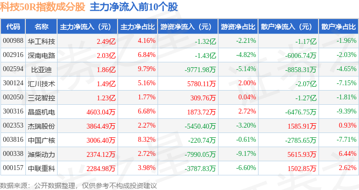 资金流向方面,科技50R(470080)指数成份股当日主力资金净流出合计40.83亿元,游资资金净流入合计6.44亿元,散户资金净流入合计34.39亿元。成份股资金流向详情见下表:
