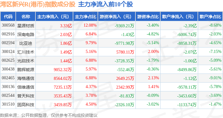 资金流向方面,湾区新兴R(港币)(480008)指数成份股当日主力资金净流出合计46.39亿元,游资资金净流入合计5.57亿元,散户资金净流入合计40.82亿元。成份股资金流向详情见下表: