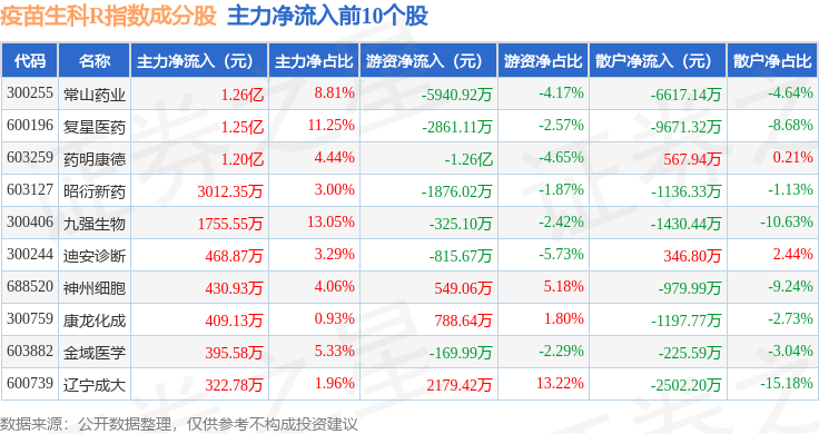 资金流向方面,疫苗生科R(480015)指数成份股当日主力资金净流出合计1.11亿元,游资资金净流出合计1.2亿元,散户资金净流入合计2.31亿元。成份股资金流向详情见下表: