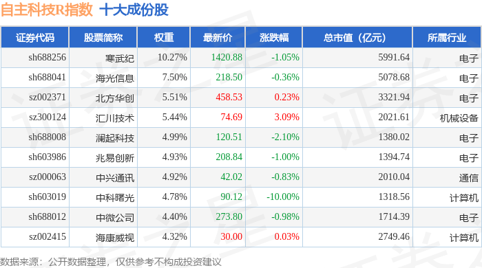 自主科技R(480033)指数十大成份股详情如下: