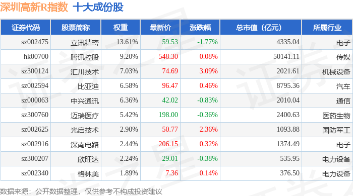证券之星消息,12月10日,深圳高新R(480038)指数报收于5413.19点,跌0.18%,成交628.91亿元,换手率1.68%。当日该指数成份股中,上涨的有27家,星源材质以8.13%的涨幅领涨,下跌的有23家,江波龙以4.21%的跌幅领跌。