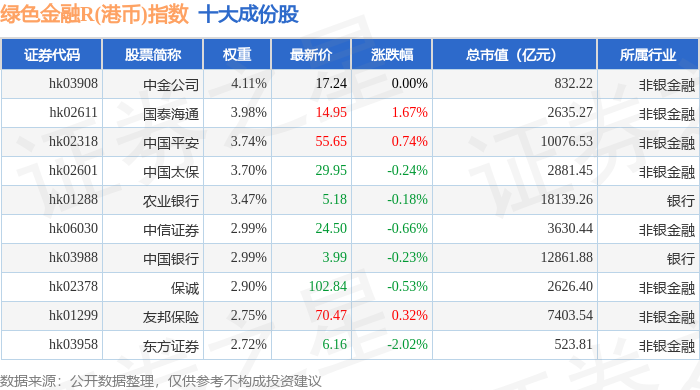 绿色金融R(港币)(480053)指数十大成份股详情如下: