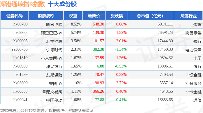 证券之星消息,12月10日,深港通综指R(483005)指数报收于7979.57点,涨0.1%,成交9138.57亿元,换手率1.3%。当日该指数成份股中,上涨的有1079家,鸿日达以13.32%的涨幅领涨,下跌的有931家,天源迪科以14.97%的跌幅领跌。