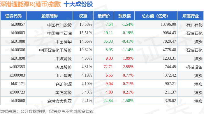 深港通能源R(港币)(483014)指数十大成份股详情如下: