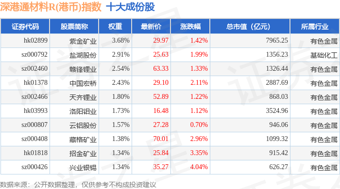 深港通材料R(港币)(483016)指数十大成份股详情如下: