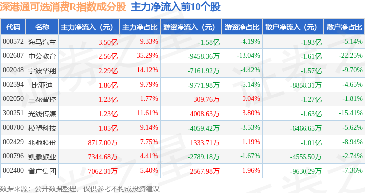 资金流向方面,深港通可选消费R(483019)指数成份股当日主力资金净流出合计6.83亿元,游资资金净流出合计2.97亿元,散户资金净流入合计9.8亿元。成份股资金流向详情见下表: