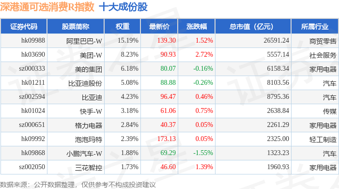 深港通可选消费R(483019)指数十大成份股详情如下: