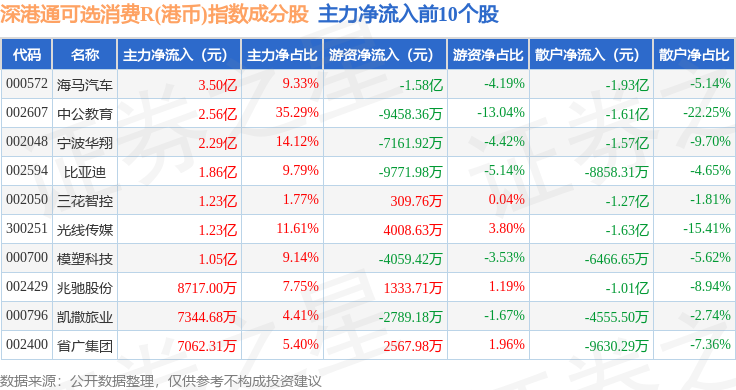 资金流向方面,深港通可选消费R(港币)(483020)指数成份股当日主力资金净流出合计6.83亿元,游资资金净流出合计2.97亿元,散户资金净流入合计9.8亿元。成份股资金流向详情见下表: