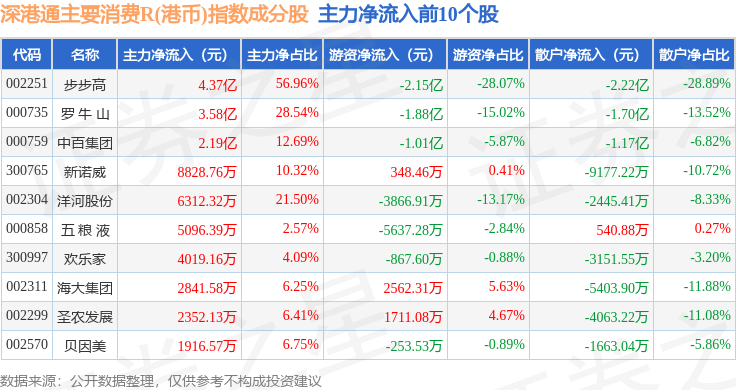 资金流向方面,深港通主要消费R(港币)(483022)指数成份股当日主力资金净流入合计8.77亿元,游资资金净流出合计2.86亿元,散户资金净流出合计5.91亿元。成份股资金流向详情见下表: