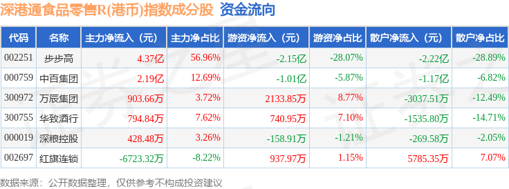 资金流向方面,深港通食品零售R(港币)(483038)指数成份股当日主力资金净流入合计6.1亿元,游资资金净流出合计2.8亿元,散户资金净流出合计3.3亿元。成份股资金流向详情见下表:
