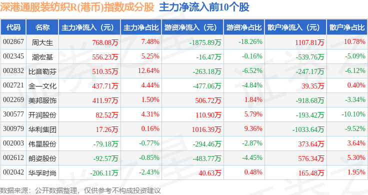 资金流向方面,深港通服装纺织R(港币)(483042)指数成份股当日主力资金净流出合计1.72亿元,游资资金净流入合计1.02亿元,散户资金净流入合计6967.13万元。成份股资金流向详情见下表: