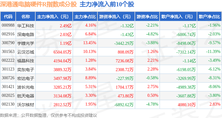 资金流向方面,深港通电脑硬件R(483043)指数成份股当日主力资金净流出合计77.82亿元,游资资金净流入合计12.12亿元,散户资金净流入合计65.69亿元。成份股资金流向详情见下表: