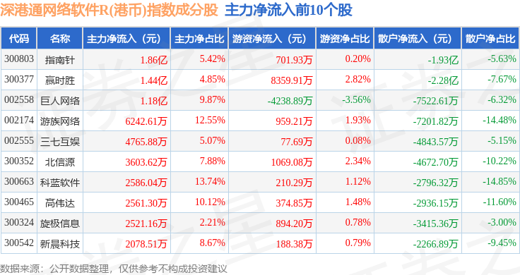 资金流向方面,深港通网络软件R(港币)(483048)指数成份股当日主力资金净流出合计16.6亿元,游资资金净流入合计2.33亿元,散户资金净流入合计14.26亿元。成份股资金流向详情见下表: