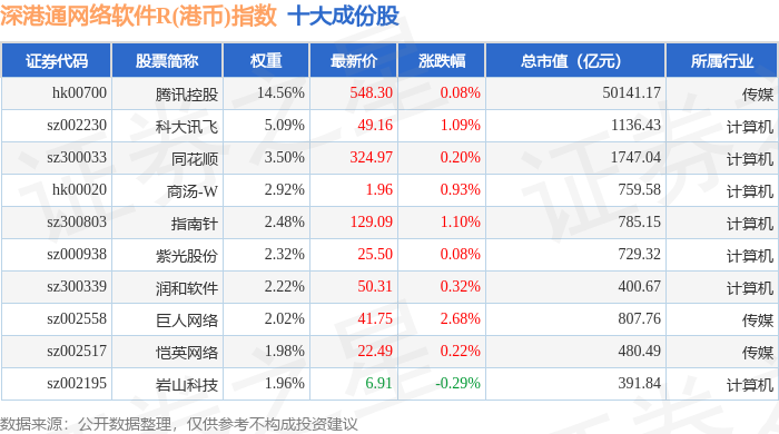 深港通网络软件R(港币)(483048)指数十大成份股详情如下: