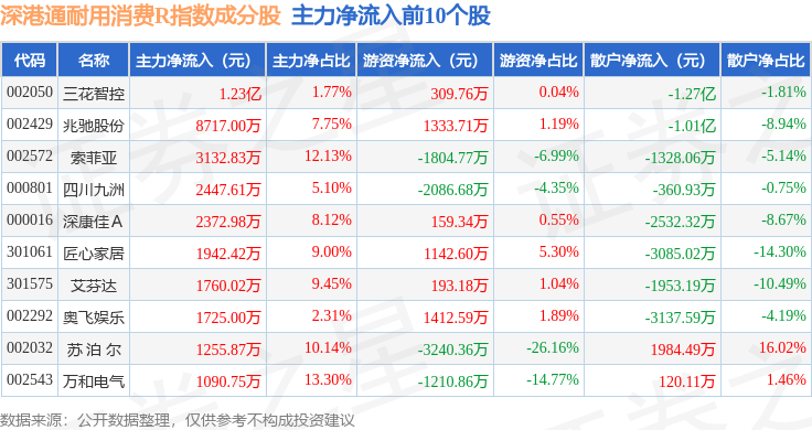 资金流向方面,深港通耐用消费R(483049)指数成份股当日主力资金净流出合计5.1亿元,游资资金净流入合计990.54万元,散户资金净流入合计5.0亿元。成份股资金流向详情见下表: