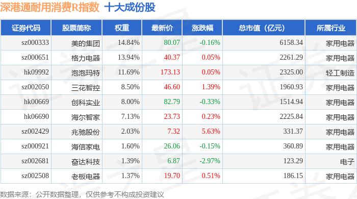 深港通耐用消费R(483049)指数十大成份股详情如下: