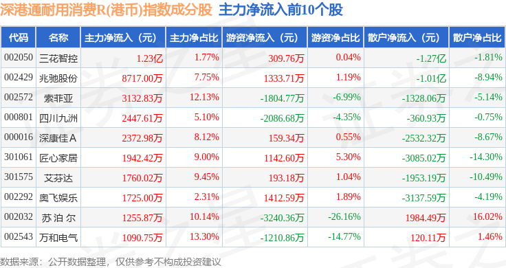 资金流向方面,深港通耐用消费R(港币)(483050)指数成份股当日主力资金净流出合计5.1亿元,游资资金净流入合计990.54万元,散户资金净流入合计5.0亿元。成份股资金流向详情见下表: