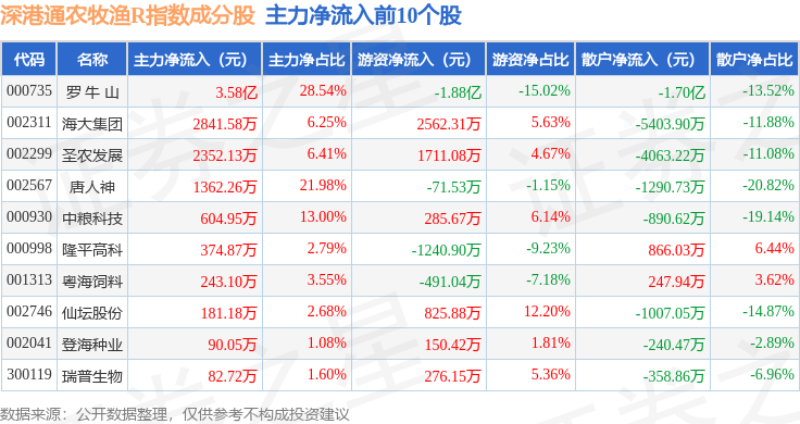 资金流向方面,深港通农牧渔R(483051)指数成份股当日主力资金净流入合计2.18亿元,游资资金净流出合计1.07亿元,散户资金净流出合计1.12亿元。成份股资金流向详情见下表: