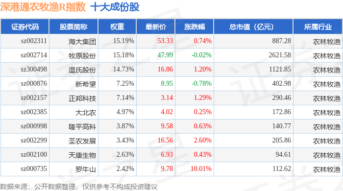 深港通农牧渔R(483051)指数十大成份股详情如下: