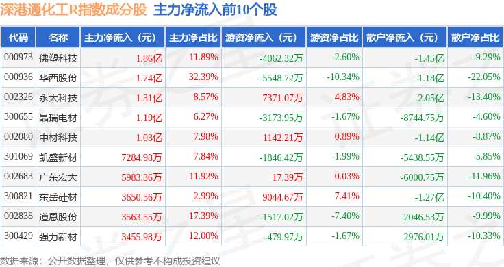 资金流向方面,深港通化工R(483063)指数成份股当日主力资金净流入合计3.05亿元,游资资金净流出合计5957.18万元,散户资金净流出合计2.46亿元。成份股资金流向详情见下表: