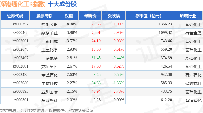 证券之星消息,12月10日,深港通化工R(483063)指数报收于6497.73点,涨0.55%,成交375.92亿元,换手率1.79%。当日该指数成份股中,上涨的有63家,华西股份以10.07%的涨幅领涨,下跌的有50家,东岳硅材以6.99%的跌幅领跌。