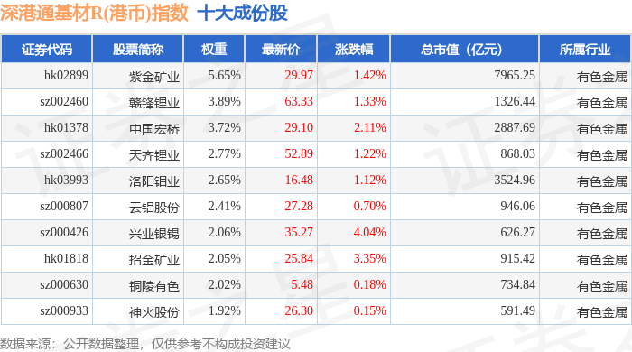 深港通基材R(港币)(483062)指数十大成份股详情如下: