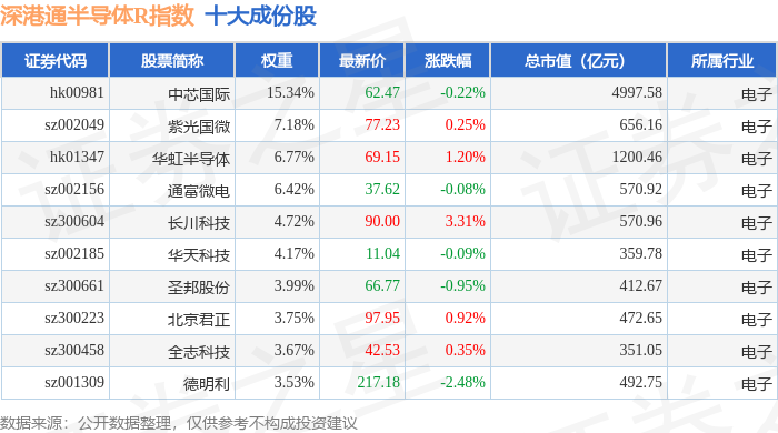证券之星消息,12月10日,深港通半导体R(483067)指数报收于14871.05点,涨0.58%,成交348.85亿元,换手率2.84%。当日该指数成份股中,上涨的有27家,赛微电子以6.82%的涨幅领涨,下跌的有12家,ASMPT以2.53%的跌幅领跌。
