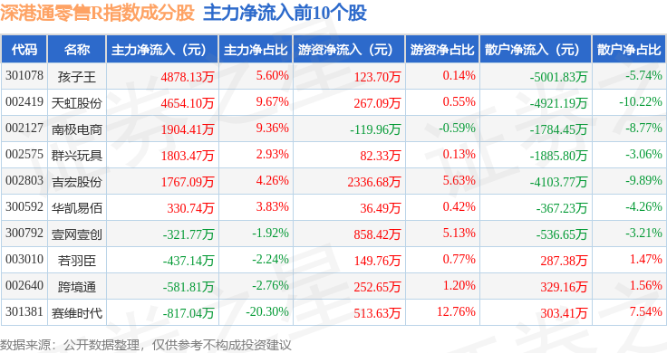 资金流向方面,深港通零售R(483073)指数成份股当日主力资金净流出合计1.08亿元,游资资金净流入合计1.2亿元,散户资金净流出合计1203.11万元。成份股资金流向详情见下表: