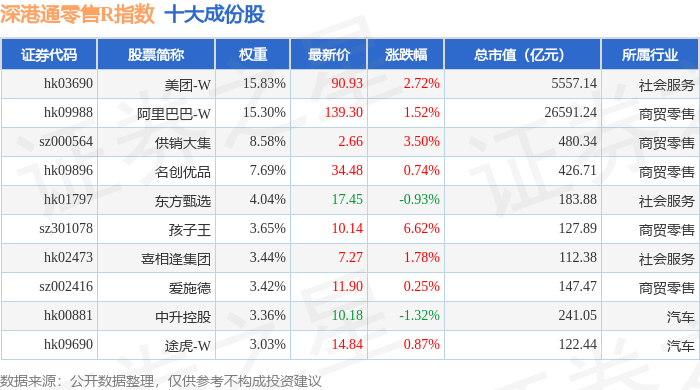 证券之星消息,12月10日,深港通零售R(483073)指数报收于2541.43点,涨1.25%,成交187.77亿元,换手率2.39%。当日该指数成份股中,上涨的有18家,孩子王以6.62%的涨幅领涨,下跌的有11家,狮腾控股以8.64%的跌幅领跌。
