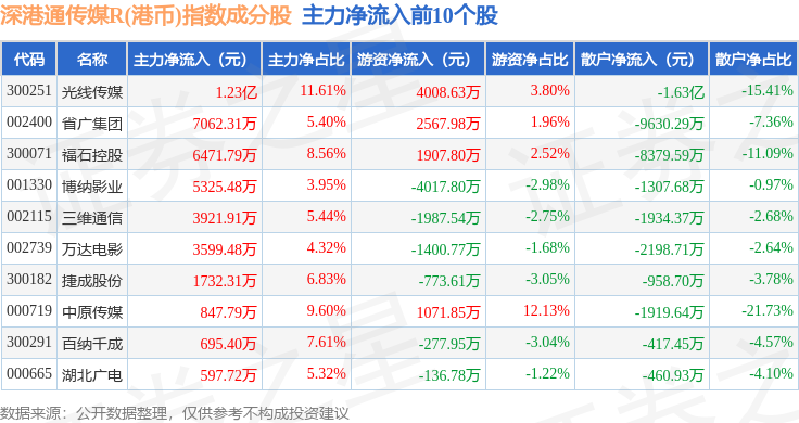 资金流向方面,深港通传媒R(港币)(483076)指数成份股当日主力资金净流出合计3.31亿元,游资资金净流入合计4841.72万元,散户资金净流入合计2.83亿元。成份股资金流向详情见下表: