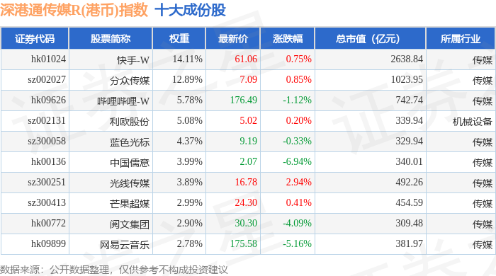 深港通传媒R(港币)(483076)指数十大成份股详情如下: