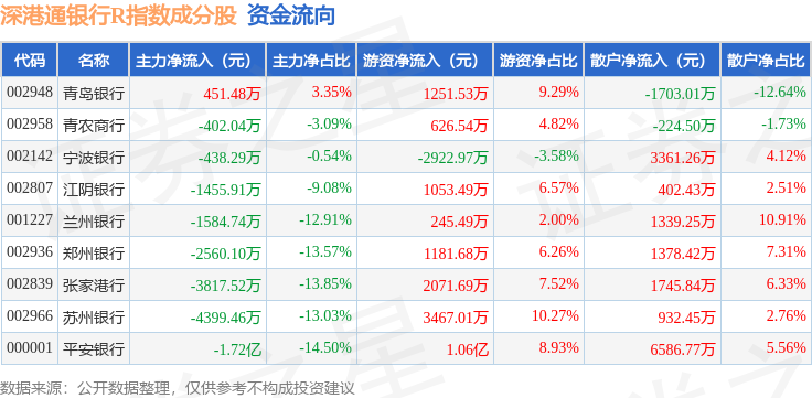 资金流向方面,深港通银行R(483081)指数成份股当日主力资金净流出合计3.14亿元,游资资金净流入合计1.76亿元,散户资金净流入合计1.38亿元。成份股资金流向详情见下表: