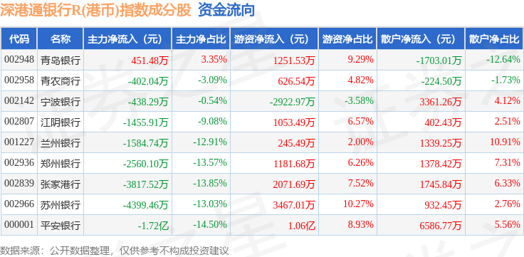 资金流向方面,深港通银行R(港币)(483082)指数成份股当日主力资金净流出合计3.14亿元,游资资金净流入合计1.76亿元,散户资金净流入合计1.38亿元。成份股资金流向详情见下表:
