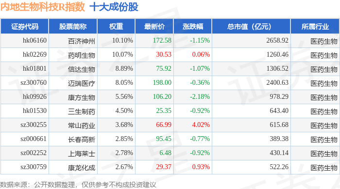 证券之星消息,12月10日,内地生物科技R(483101)指数报收于3271.97点,跌0.54%,成交123.93亿元,换手率0.8%。当日该指数成份股中,上涨的有25家,常山药业以4.02%的涨幅领涨,下跌的有24家,再鼎医药以4.42%的跌幅领跌。