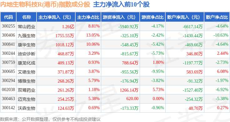 资金流向方面,内地生物科技R(港币)(483102)指数成份股当日主力资金净流出合计2.34亿元,游资资金净流出合计2650.03万元,散户资金净流入合计2.6亿元。成份股资金流向详情见下表: