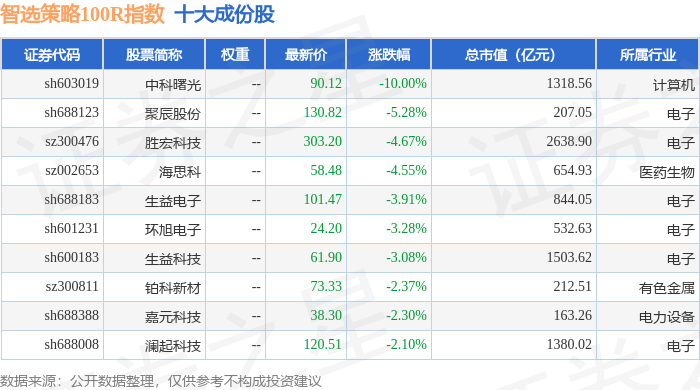 证券之星消息,12月10日,智选策略100R(489015)指数报收于4970.95点,涨0.01%,成交2271.22亿元,换手率2.74%。当日该指数成份股中,上涨的有53家,长飞光纤以10.0%的涨幅领涨,下跌的有47家,中科曙光以10.0%的跌幅领跌。