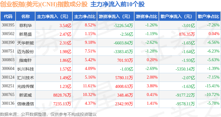 创业板指(美元)(CNH)(970007)指数十大成份股详情如下: