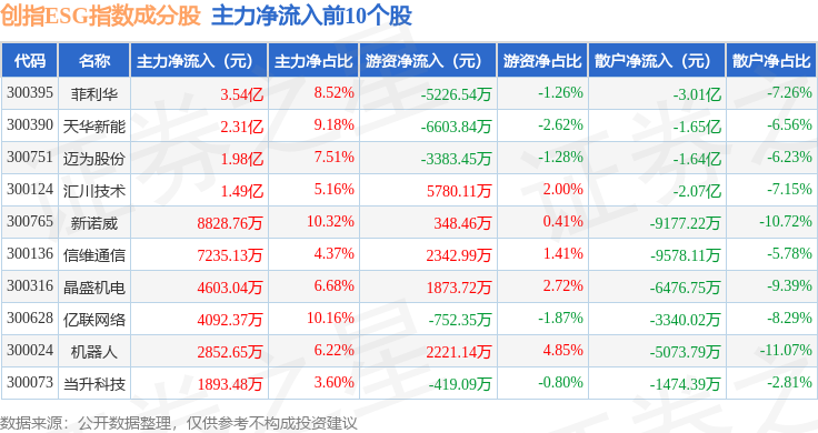 资金流向方面,创指ESG(970028)指数成份股当日主力资金净流出合计57.95亿元,游资资金净流入合计19.99亿元,散户资金净流入合计37.96亿元。成份股资金流向详情见下表: