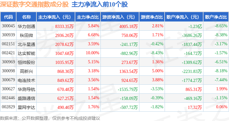 资金流向方面,深证数字交通(970049)指数成份股当日主力资金净流出合计6.29亿元,游资资金净流入合计2459.3万元,散户资金净流入合计6.05亿元。成份股资金流向详情见下表:
